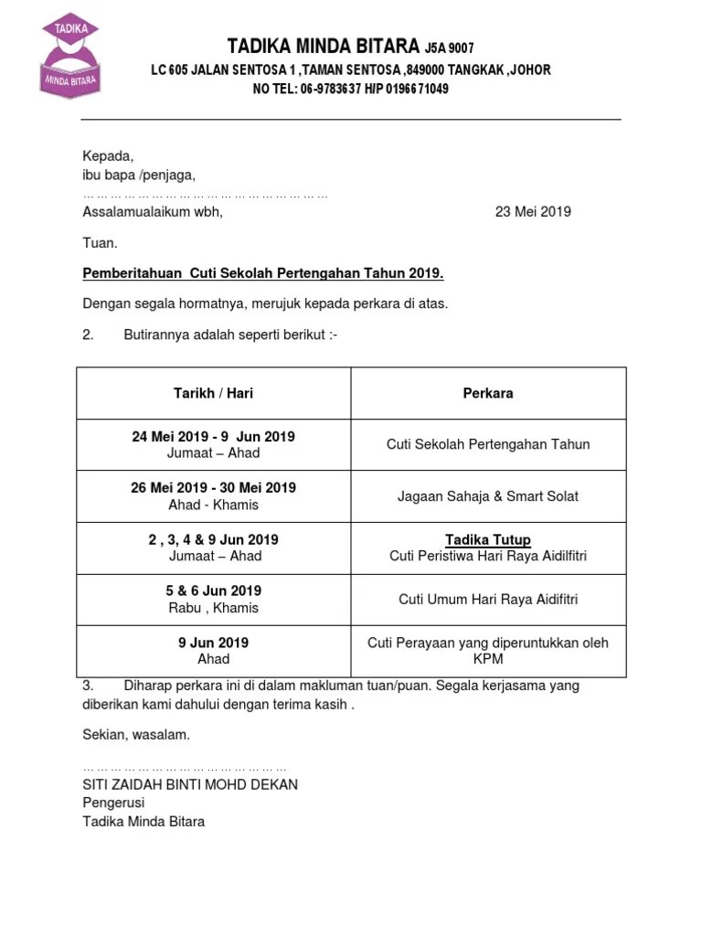 For more information and source, see on this link : Ia dianggap sebagai salah satu dari dua perayaan yang. For more information and source, see on this link : Tarikh hari cuti sekolah malaysia 2019 cny hari raya deepavali. Cuti tanpa rekod untuk penjawat awam sambut good friday. 15 contoh surat permohonan cuti paling lengkap jika anda seorang karyawan perusahaan pegawai negeri sipil atau bahkan mahasiswa tentunya tidak asing lagi dengan surat cuti. Pekeliling cuti perayaan pasti 2019 pra tahfiz pasti al syifa facebook. Ini kerana dalam kalendar yang ada cuti sekolah bertanda kuning hanya sehingga 9 jun 2019 sahaja. For more information and source, see on this link : To find out more complete and clear information or images, you can visit the source. Pengumuman penetapan tarikh hari raya aidilfitri 2019 1440. Skrol ke bawah untuk melihat senarai kalendar seluruh negara atau pilih kalendar negeri anda. Contoh karangan surat kiriman rasmi spm contoh laporan kemalangan di tempat kerja jkkp contoh kertas kerja permohonan dana perniagaan contoh laporan kewangan.