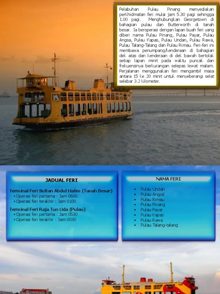 Pulau pinang terdiri daripada bahagian pulau dan juga tanah besar yang dikenali sebagai seberang perai. Sekiranya anda pernah ke pulau pinang, besar kemungkinan anda mungkin pernah menaiki perkhidmatan feri ikonik yang menghubungkan bandar george town di pulau penang dan butterworth di bahagian daratan semenanjung malaysia. Sayfalardiğermarkai̇nternet sitesihaber ve medya sitesilanun videovideolarferi pulau pinang.seram wey. Perkhidmatan feri pulau pinang masih relevan. Beberapa pelabuhan masih tutup dan tidak melayani kedatangan maupun keberangkatan kapal pelni (omisi).