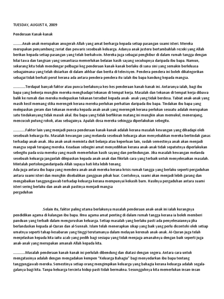 Isi karangan penderaan kanak kanak. * penderaan seksual, rogol, pencabulan kanak2 dan gejala pedofil bukan perkara ringan. Pada masa kini, lima kategori sikap tingkah laku buruk ibu bapa yang mampu dikelaskan sebagai penderaan mental adalah penolakan, pengasingan. Setiap kali mahu dihantar ke pusat asuhan, anaknya akan menangis. Hidup seperti orang yang sudah tiada tamadun dan akal fikiran.