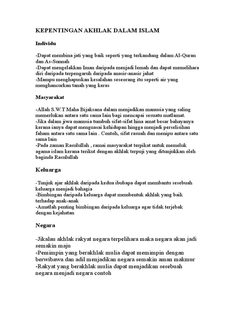 Para pegawai mereka juga berakhlak mulia. Jika perlakuan atau perbuatan yang terjadi itu baik dan terpuji menurut hukum syarak dan pertimbangan akal yang waras maka keadaan perihal jiwa tersebut dikatakan sebagai akhalk yang baik, jika sebaliknya yang terjadi, maka dinamakan akhlak yang buruk/jahat. Boleh tadhkkur ( تَذَكُّرْ ) iaitu inga. Profesor madya dr khalif muammar a.harris, pensyarah pusat pengajian tinggi islam dan pedabadan universiti teknologi malaysia dalam rancangan tarbiyyah di radio ikimfm yang bersiaran setiap jumaat jam 10.15 pagi, telah membincangkan berhubung dengan kepentingan pendidikan akhlak dalam masyarakat hari ini. Dec 03, 2019 · pembentukan akhlak yang baik dan pengaruh pendidikan agama islam terhadap pembentukan akhlak. More images for kepentingan akhlak dalam islam » Rasulullah (s.a.w.) adalah berakhlak paling mulia. Berdaya melahirkan perlakuan secara spontan dan mudah. Boleh kita anggap bahawa satu senario suram telah dan sedang melanda umat islam di seluruh dunia. Kepentingan akhlak dalam kehidupan prinsip islam menekankan soal kejujuran, melahirkan masyarakat yang tanggungjawap, dan saling menghormati dan sebagainya. إنما بعثت لتمم مكارم الخلق maksudnya: Free online tests and answers Setelah kita renungkan dari berbagai sudut seperti yang terdapat di atas jelas sekali kepimpinan islam perlu dianyam dengan rapi dengan semua warna dan corak akhlak islamiyyah yang telah terbukti kewibawaannya dan kesannya yang begitu baik seperti yang pernah ditunjukkan dalam sirah nabawiyyah dan perjalanan hidup umat islam di zaman khulafa' rasyidin.