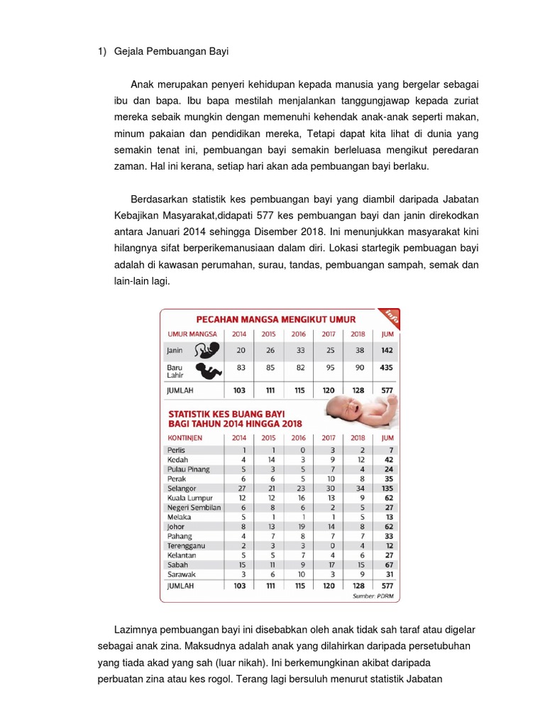 Kes Pembuangan Bayi 2018 / Buang Bayi Setiap 3 Hari : Tekanan yang berlaku juga menjadi punca kepada perbalahan dalam kalangan ahli keluarga.. Hukuman mati bagi kes buang bayi. Dianggarkan bagi tempoh 2008 hingga 2009, sebanyak 181 kes pembuangan bayi dilaporkan di malaysia, manakala 60 kes direkodkan sejak awal tahun 2010 hingga 12/8/2010. Kes baru penyalahgunaan dadah sebanyak 18,440 dan kes berulang 7,484 orang yang terlibat dengan dadah. Pembuangan bayi, khalwat, rogol dan penyalahgunaan dadah. Kesan ketidakstabilan politik terhadap hubungan etnik di malaysia;
